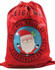 Brun julsäck med jultomten och texten "25 december jul", "nordpolen" och "Specialleverans". Väskan mäter ca 80x50 cm och har en dragsko som du kan knyta upp.