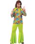 Hippiedräkt till man bestående av färgrik skjorta och grön utsvängd byxa.