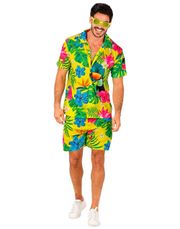 Läcker Hawaiikostym till dam bestående av kjol med resår-kant i livet, knyttopp, hårpynt och smyckekrans.