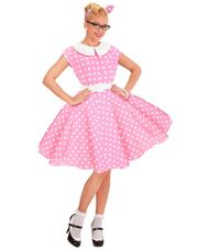 Ljusblå och vit 50-tals rockabilly dräkt bestående av klänning med motiv av prickar samt underkjol och vitt bälte. Komplettera gärna din dräkt med underkjol för mer fyllnad, peruk, kostymglasögon, kostymsmycken, kostymskor, strumpor / strumpbyxa / sockor, handskar och andra kostymtillbehör. - Stora beställningar