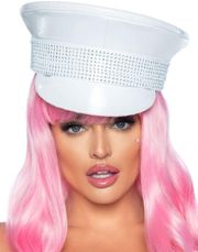 Elegant kostym av marinkapten för män. Dräkten består av en överdel, byxor och hatt med guldfärgade knappar, ränder och logga.