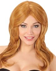 Neonorange peruk med lugg och vågor i längden som lyser under UV/Blacklight.