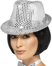 Neonrosa fedorahatt med glittrade paljetter och band. - Stora beställningar