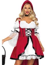 Maskeraddräkten har en vacker, djup röd färg som fångar uppmärksamheten omedelbart. Den eleganta kappan med huva ger en mystisk och förtrollande look, perfekt för en kväll med äventyr. Den korta klänningen har en klassisk svartvit snörliv som framhäver figuren, medan de delikata spetskanterna ger en touch av elegans.