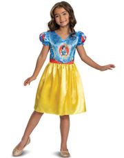 Licensierad Disney Snövit kostym för barn. Kostym består av en klänning med en gul kjol, ett blått liv med broderi från kjolen upp till kragen mitt på magen/bröstet, en vit mesh "slöja" längs kragen, en "medaljong" med en bild av Snow Vita och korta p