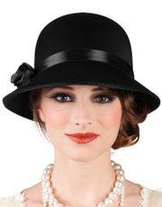 Här dras du rakt tillbaka till 20-talet. Vi drömmer oss tillbaka till flapper-modet och foxtrot dans. Svart Charlestonhatt pyntad med band och blomma, perfekt till din gatsbydräkt :) - Stora beställningar