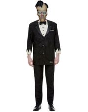 Dräkten består av en svart klänning med vita dödskallar som pryder dräktens nedre del. Denna läskiga och stilfulla detalj ger dräkten en extra touch av skrämmande elegans.